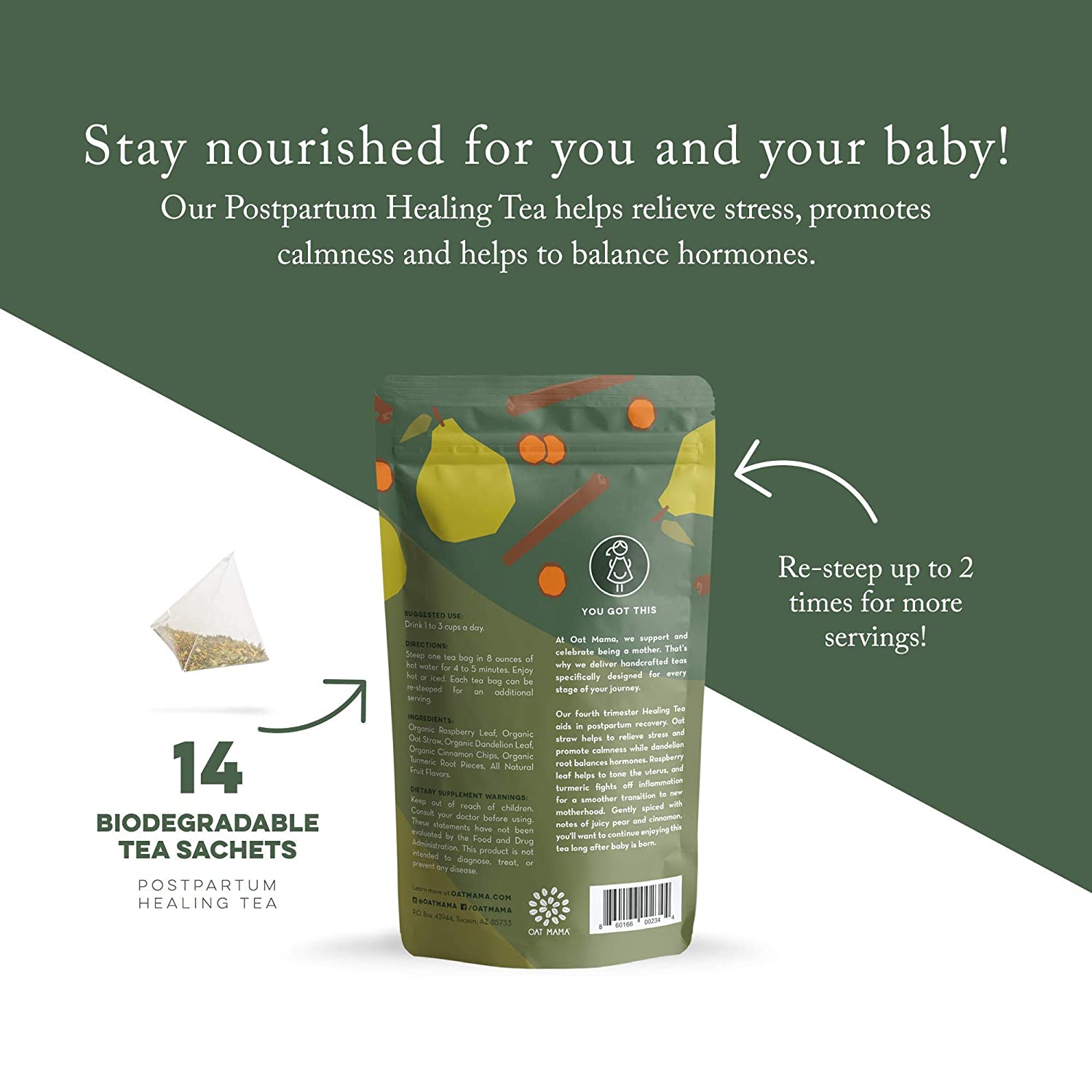 Postpartum Healing Tea helps with a new mother's postpartum recovery during the fourth trimester. Oat Straw helps to relieve stress and promote calmness while Dandelion Root helps to hormone balance. Raspberry Leaf helps to tone the uterus after labor, and Turmeric fights off inflammation for a smoother transition to new motherhood. Gently spiced with notes of juicy pear and cinnamon, you'll want to continue enjoying this tea long after baby is born.