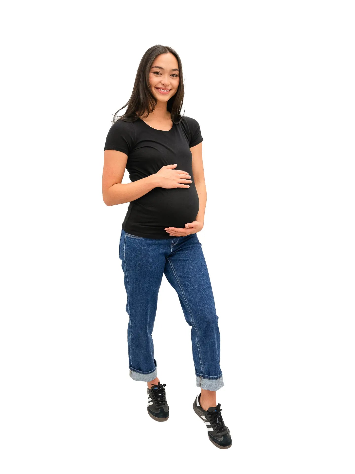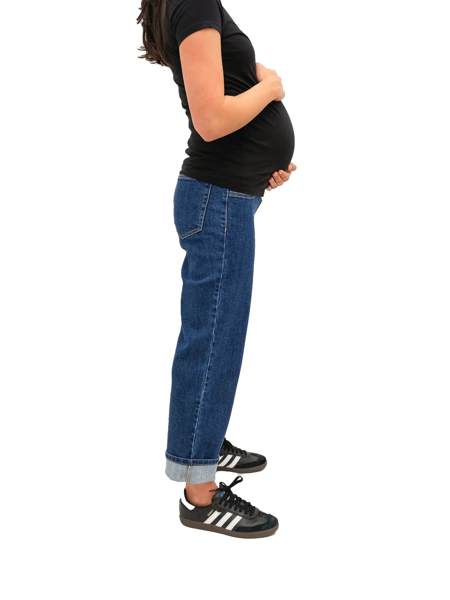 Channel '90s dad-jean style in these relaxed-fit maternity jeans featuring a stretchy over-the-bump waistband for secure support throughout each trimester.