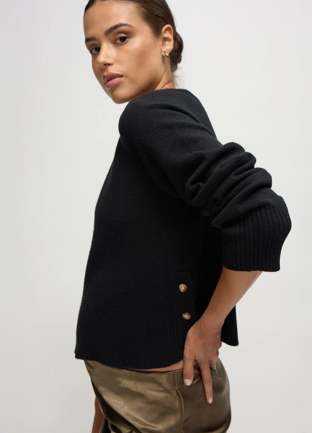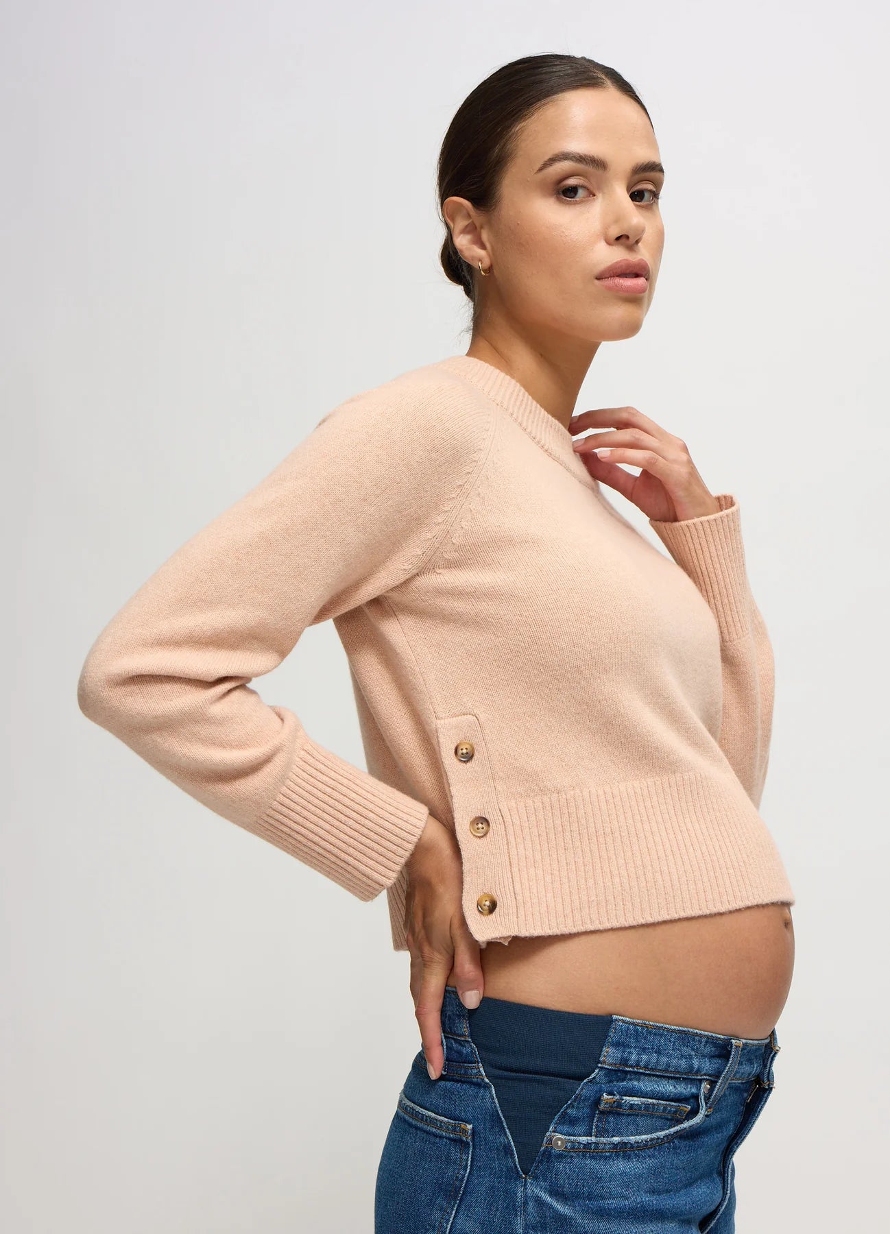 A shape-friendly favorite you’ll reach for again and again. This sweater is knit from a supersoft yarn with a bump-loving fit and mockneck silhouette. Side buttons open up for flexible styling (and post-baby nursing ease), while the cropped length pairs effortlessly with high-rise leggings or the matching pants. Finished with ribbed trim for a polished look that goes from couch to coffee run in seconds.