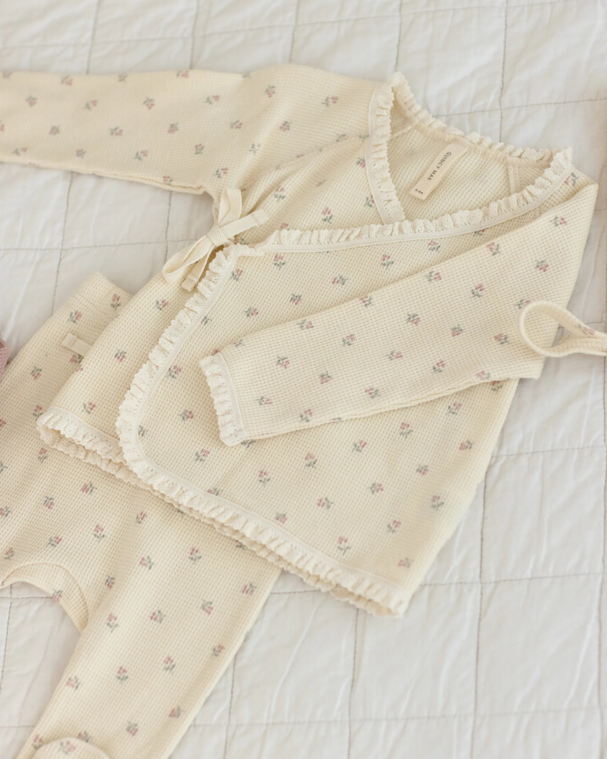 The Take Me Home Set is a soft, lightweight waffle fabric 3 piece set for welcoming your newborn home. Made of 100% organic cotton, this sweet set includes a bonnet, a wrap snap and tie top, and footed drawstring pants.