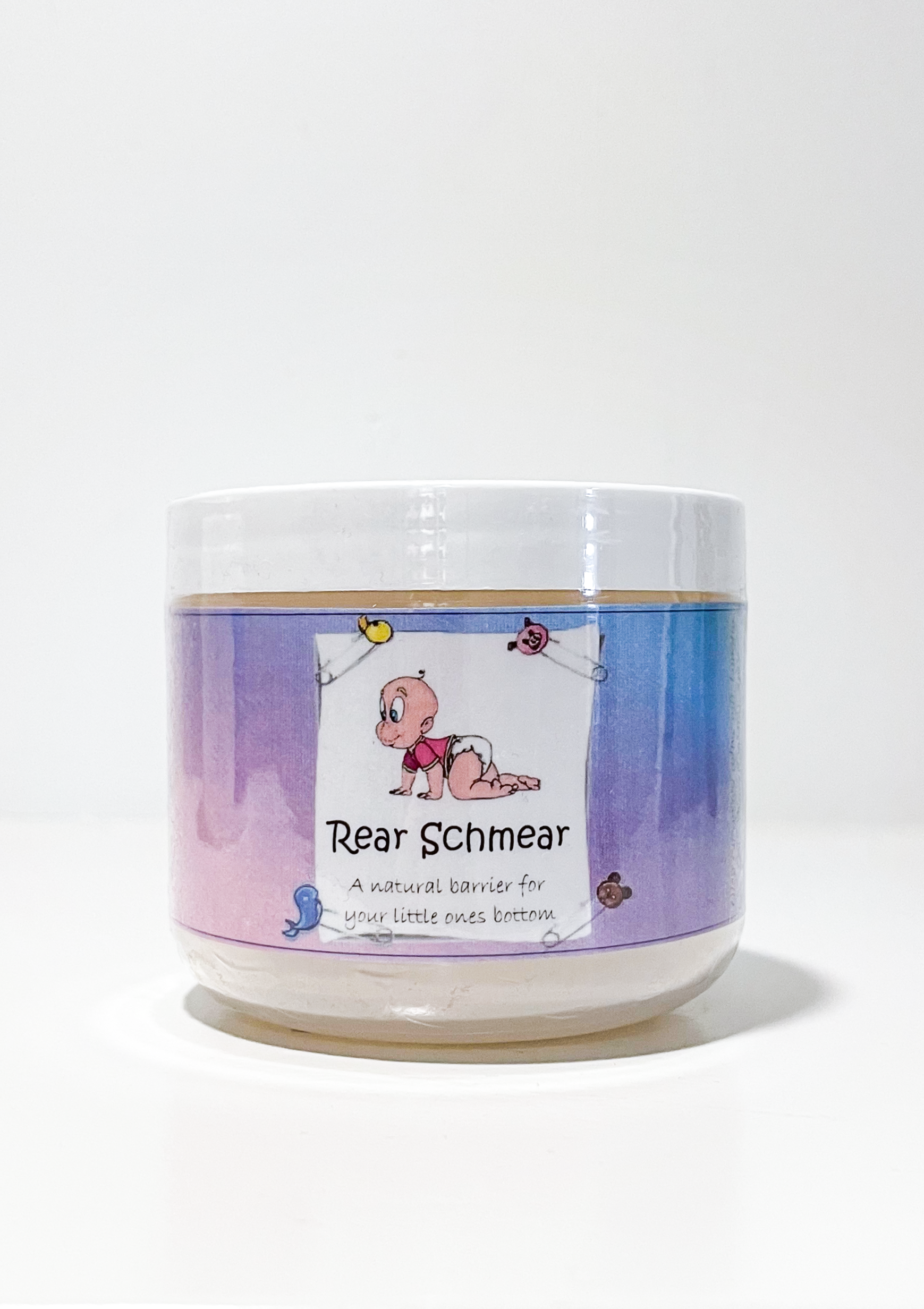 Rear Schmear is a natural ointment for soothing dry and chapped skin. This preventes diaper rash, which is the primary goal. Rear schmear also works great on dry elbows, cuticles, and chapped lips.