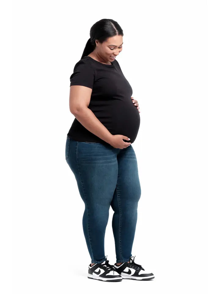 Buttery soft dark indigo ankle length skinny jeans with a soft and easy supportive belly band to cradle your beautiful bump.