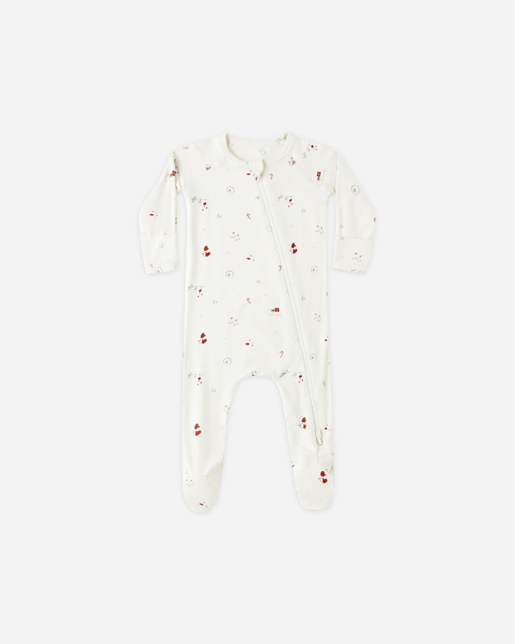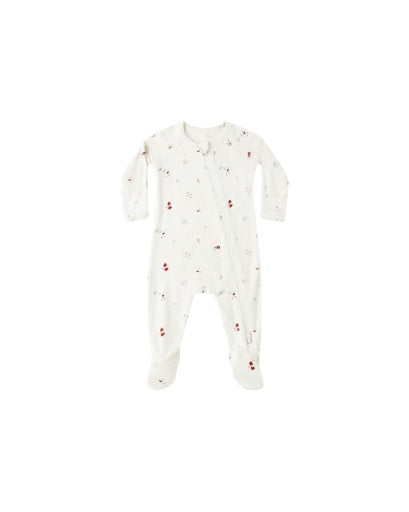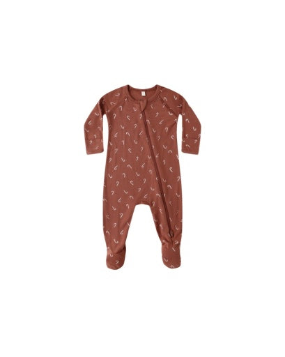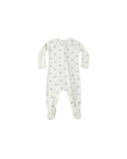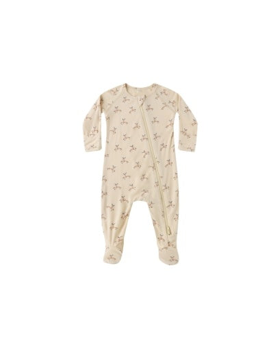 Full double-zip footie crafted from our soft and stretchy bamboo fabric. Fold-over hand mitts included on sizes NB – 3-6M. Raised screen print on soles of size 6-12M for added traction.