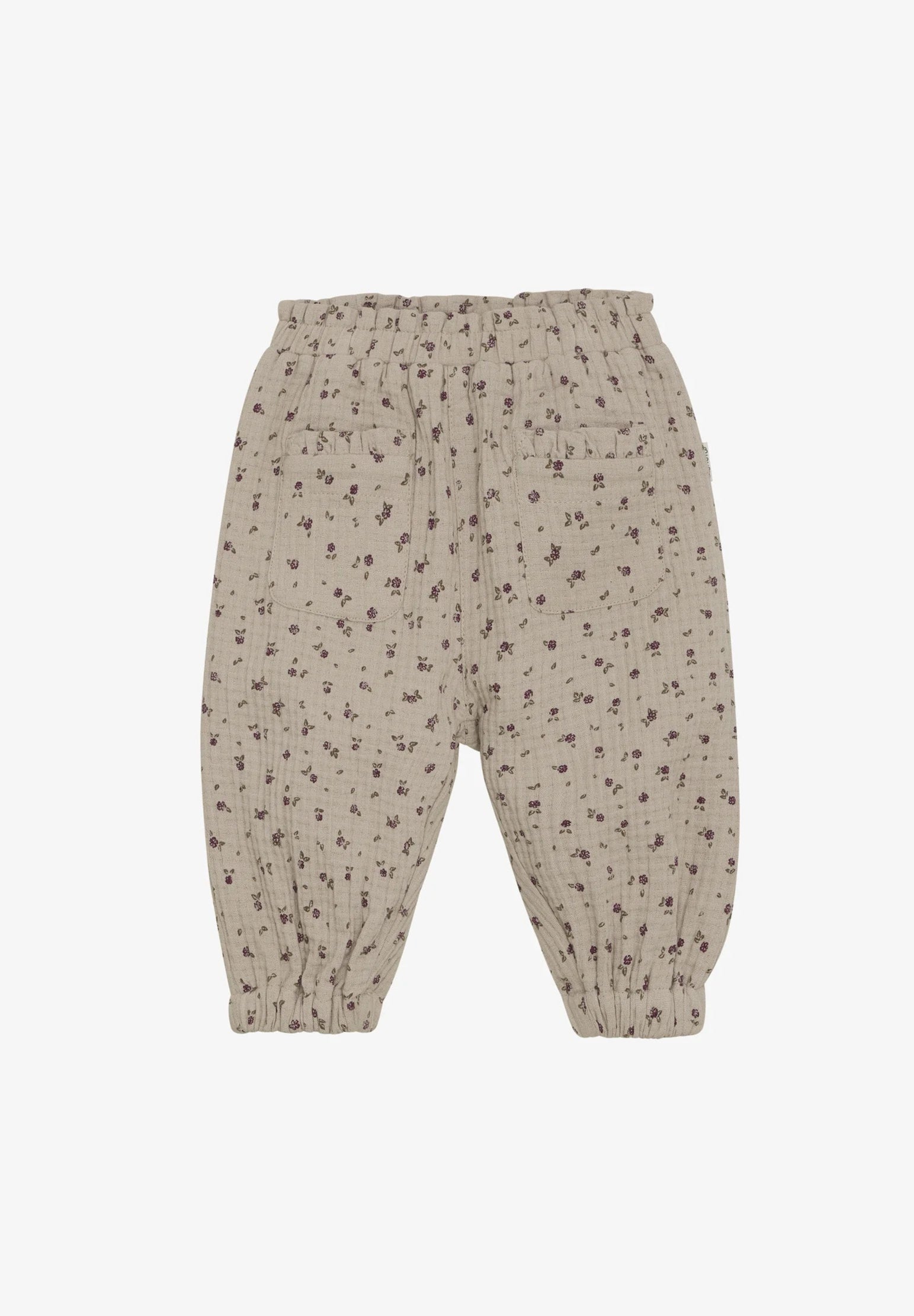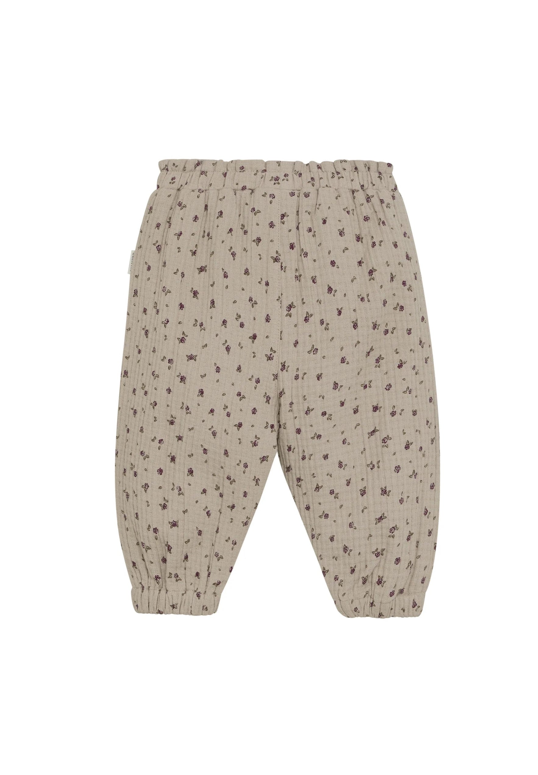 These muslin pants, made from 100% cotton, offer a comfy adjustable waist, cute pockets, charming ruffle accents, and a gentle floral design—ideal for your little one’s playful days.