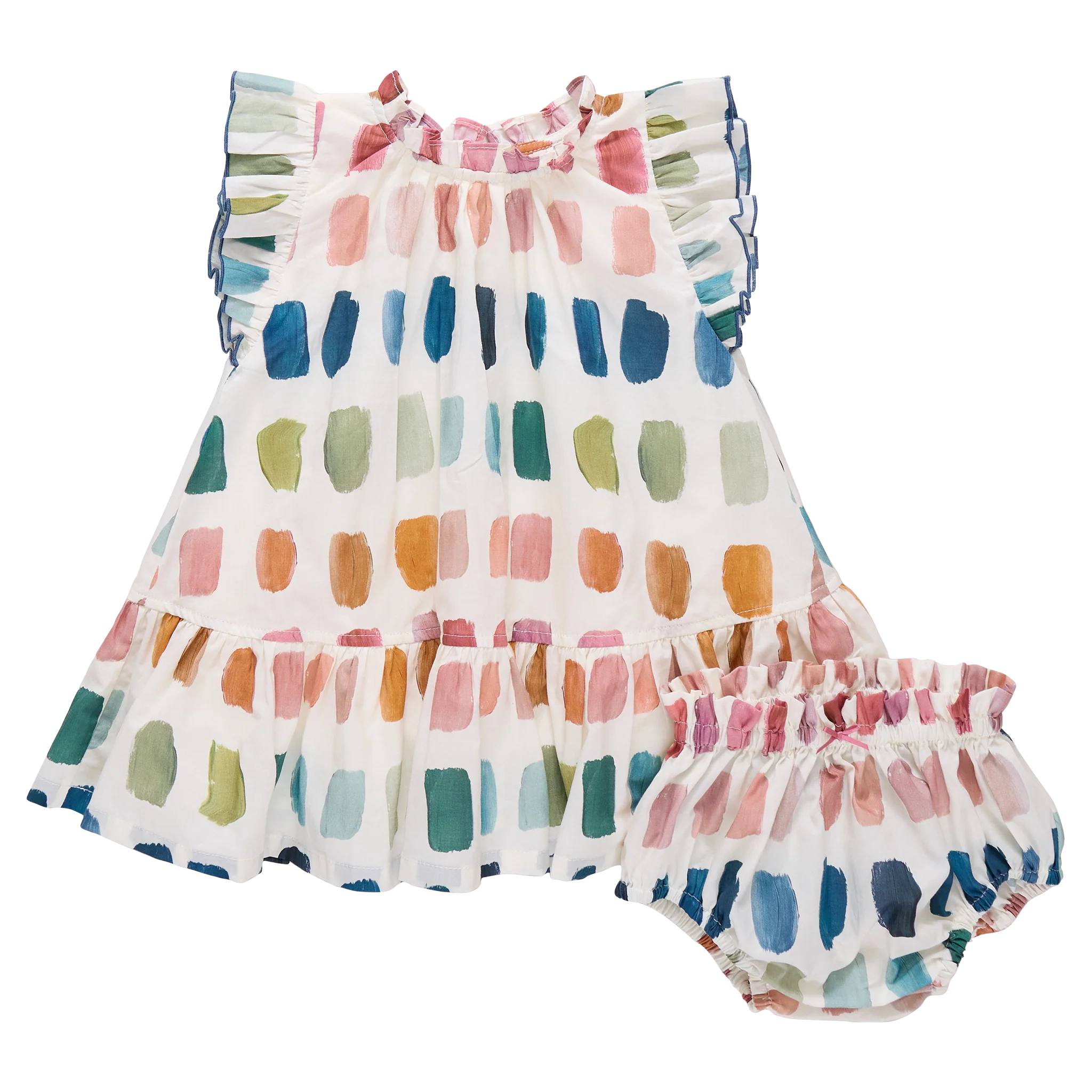 A playful statement style made for spring celebrations! The Baby Girls Harper Dress Set features a hand painted paint swatches print on airy 100% cotton voile. Designed with ruffle cap sleeves and a ruffled neckline, blue pearl stitch detailing at the sleeves, and a softly tiered skirt, this breezy silhouette is perfect for warm days. The matching diaper cover is finished with a sweet pink satin bow.
