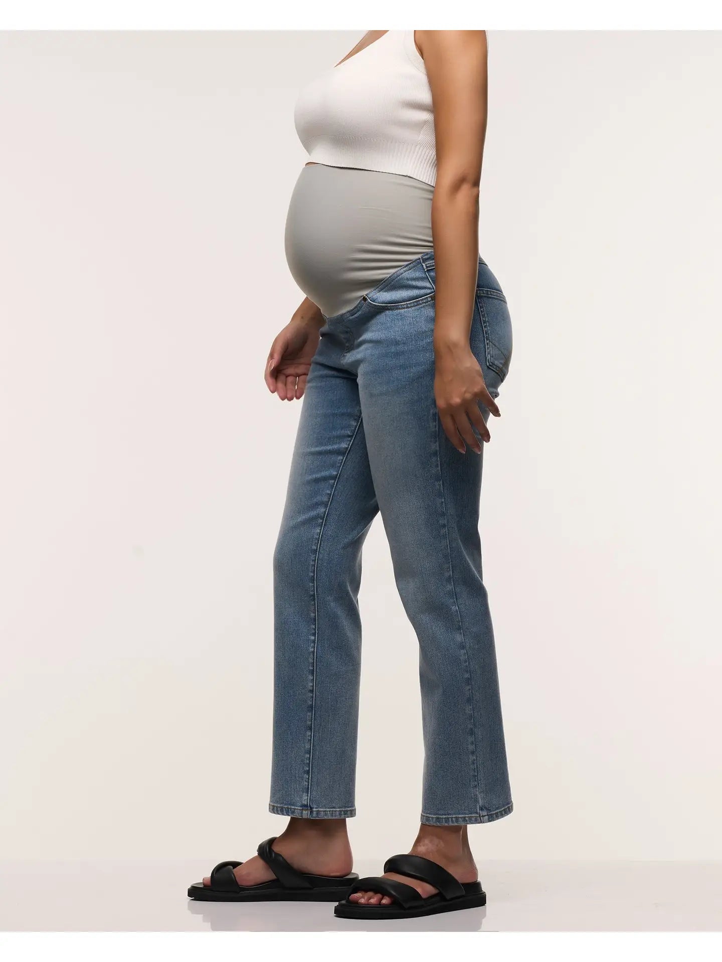 * Four way stretch over belly waistband * Cropped length * 5 pocket design Crafted in an incredibly soft denim with the perfect amount of stretch, our Heaven Slim Over belly Jeans have a sleek slim leg silhouette which is extremely flattering on every mama. Our signature four way stretch over belly waistband adds extra support which can also be folded over and worn under your bump, and they feature a classic 5 pocket design