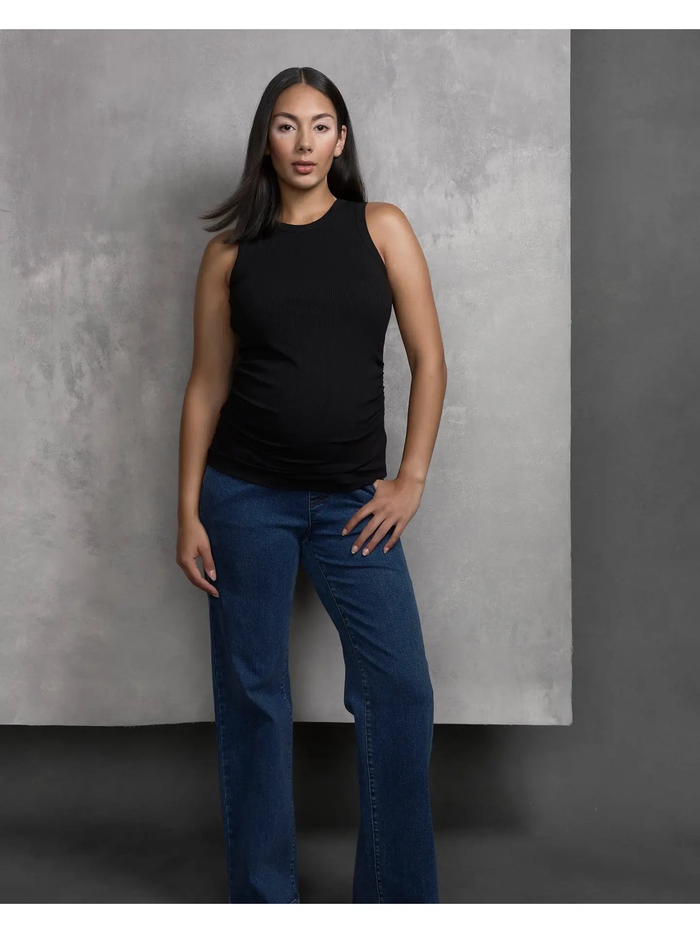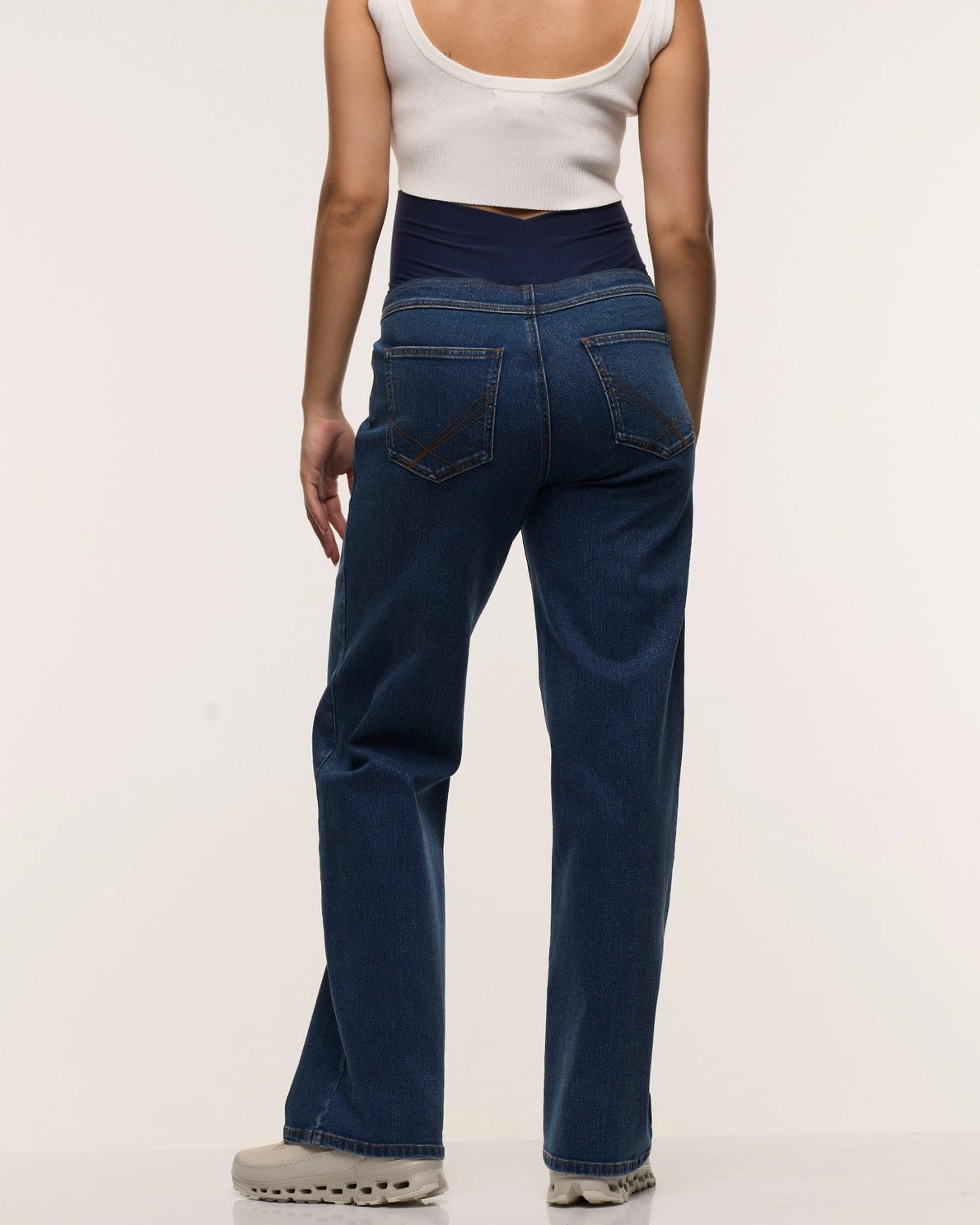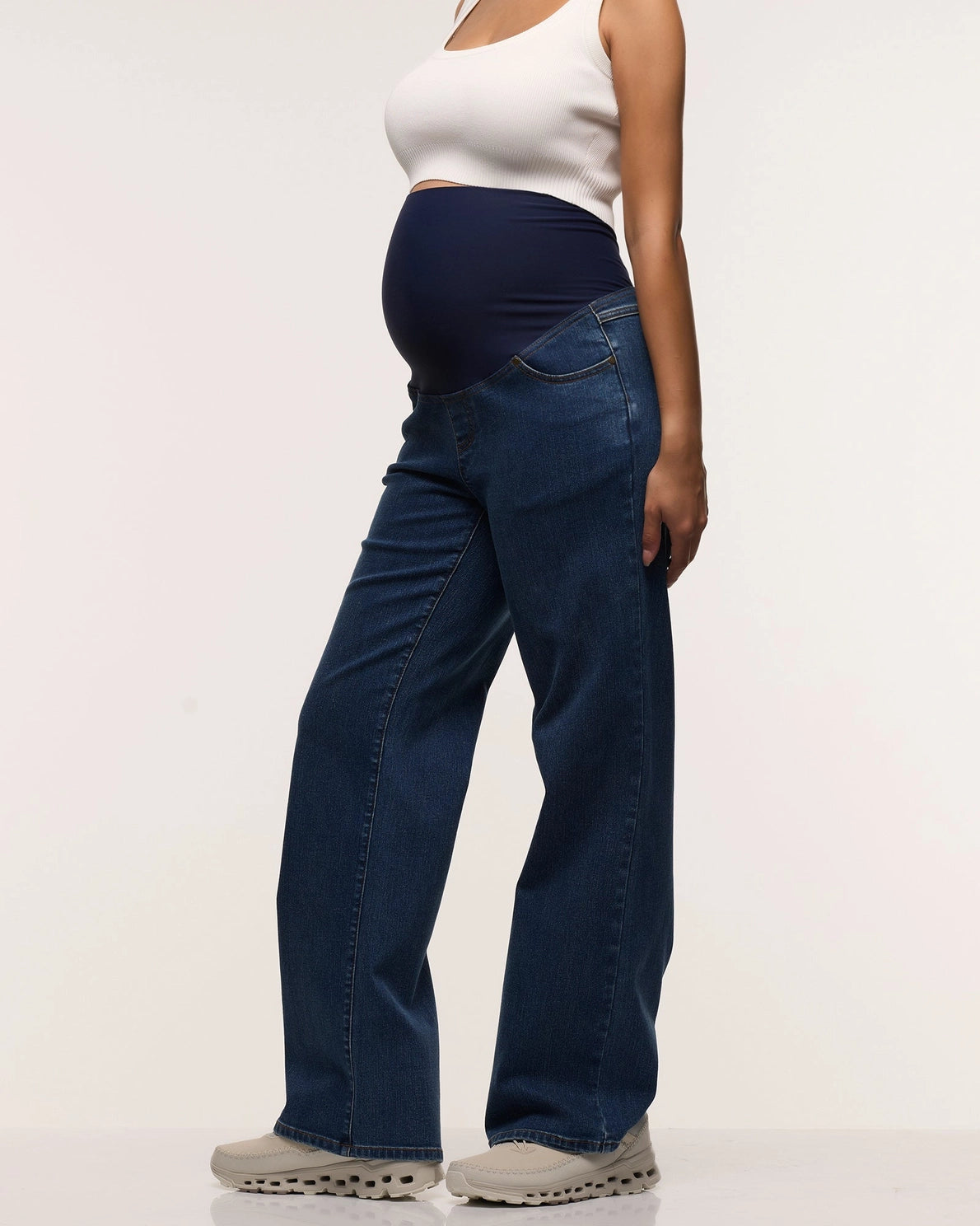 4-way stretch knit fabrication waistband * High waist * Wide legs * Full-length Cool and completely on-trend, our Straight Leg Over belly Jean has been designed with the fashion conscious mama in mind! With a full length, straight leg silhouette and made in premium stretch denim, these jeans also feature our signature over belly waistband that gives added support and won’t slip down.