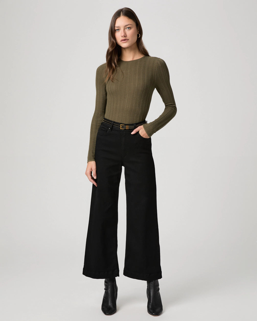 This high-rise wide leg has a slightly relaxed fit and an ankle length silhouette. In our best-selling black shadow wash, this pair is cut from TRANSCEND, the original high-stretch fabric that redefined comfort in denim.