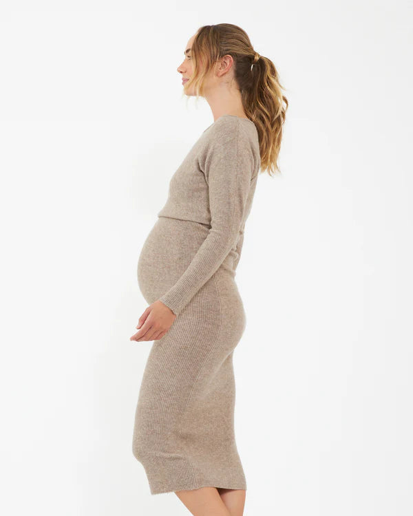 What's not to love about the Tobie Off Shoulder Dress? Draped design, off the shoulder, midi-length, made from a wool-blend that is designed to skim the body. Combining comfort and elegance in one, the boat neckline adds a touch of sophistication, whilst the ribbed skirt is designed to accommodate your growing bump. The relaxed bodice contrasts perfectly with the fitted skirt, creating an in-vogue silhouette. Pair it with your favorite boots or heels.