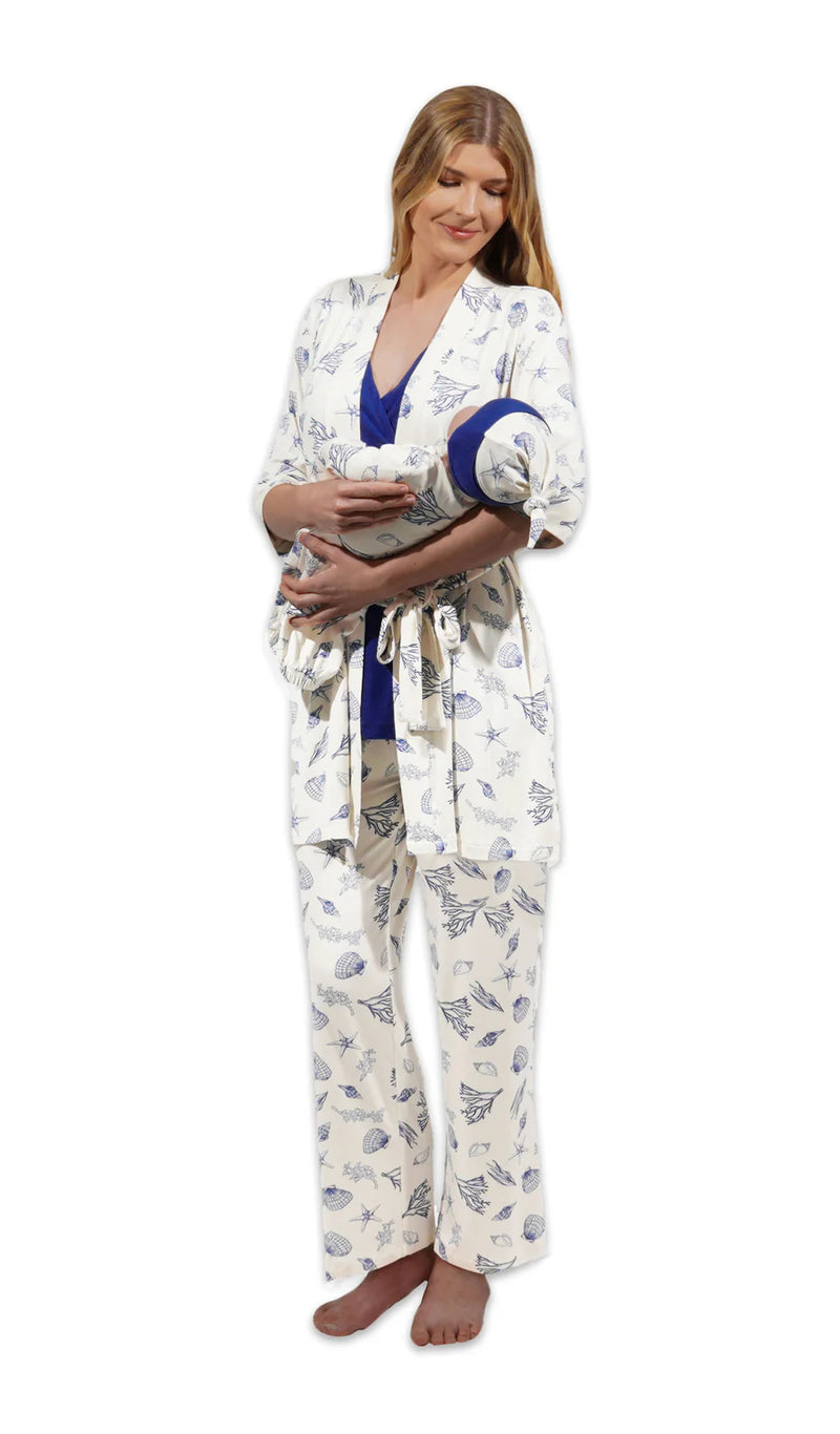This soft and stylish 5-piece gift is the perfect sleep and loungewear set. Top has a criss-cross bust, while the pant has a stretchy, smocked waistband. Short 3/4-sleeve robe is a stylish cover up.
