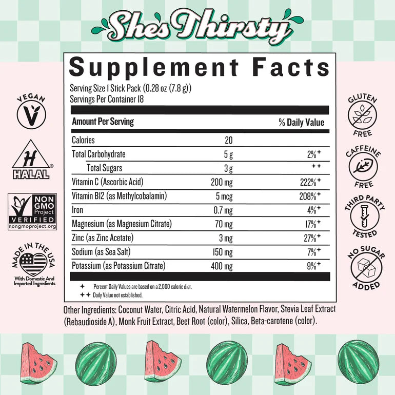 Watermelon: Vitamin C (Ascorbic Acid), Vitamin B12 (as Methylcobalamin), Iron, Magnesium (as Magnesium Citrate), Zinc (as Zinc Acetate), Sodium (as Sea Salt), Potassium (as Potassium Citrate), Coconut Water, Citric Acid, Natural Watermelon Flavor, Stevia Leaf Extract (Rebaudioside A), Monk Fruit Extract, Beet Root (color), Silica, Beta-carotene (color).