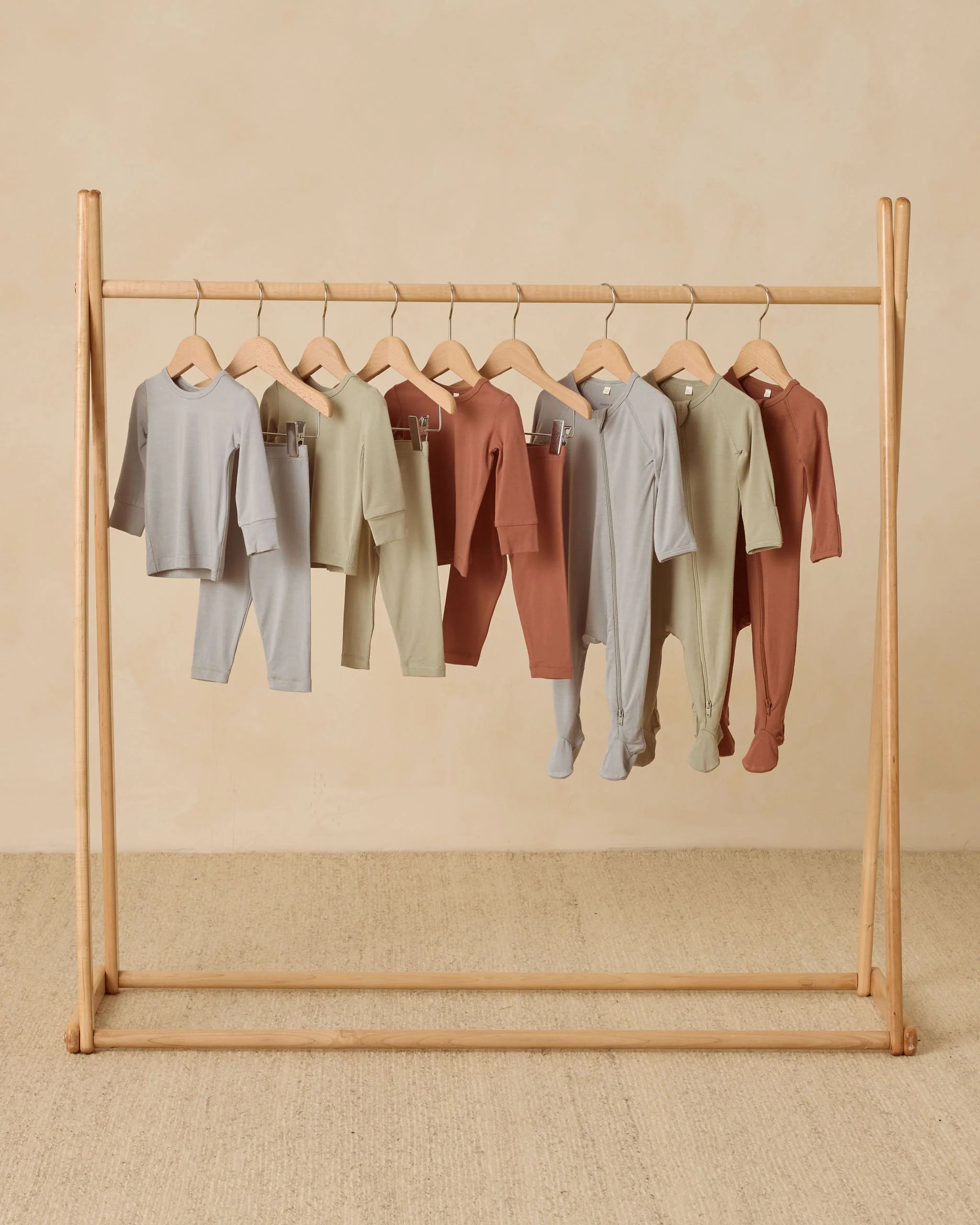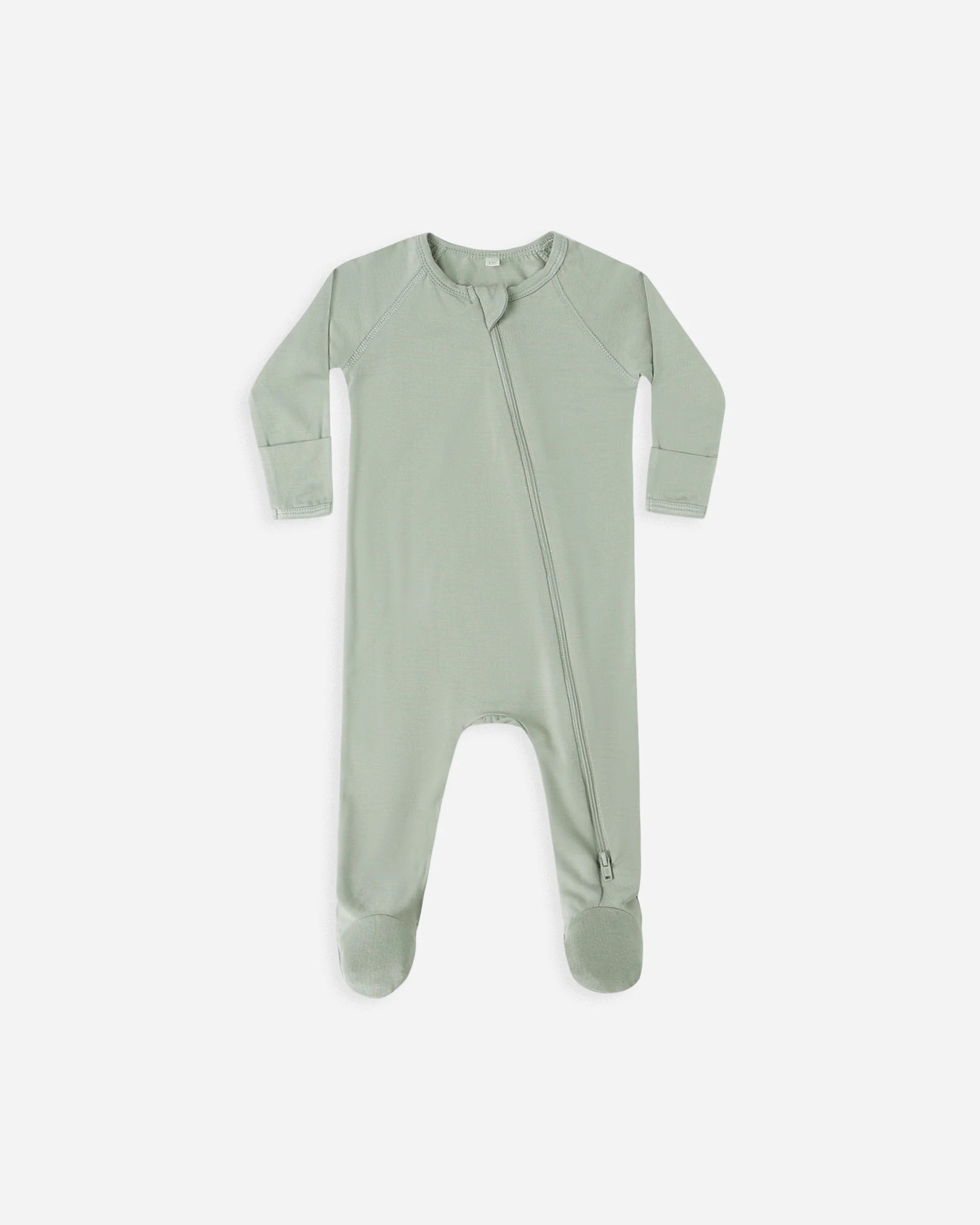 Full double-zip footie crafted from Quincy Mae's soft and stretchy bamboo fabric. Fold-over hand mitts included on sizes NB – 3-6M. Raised screen print on soles of size 6-12M for added traction.