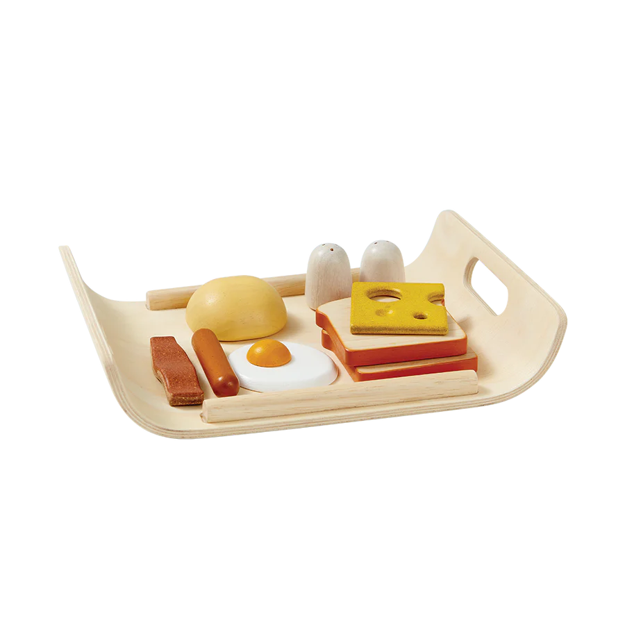 - Start your day with a healthy breakfast! Set includes 2 slices of bread, a bun, sausage, slice of bacon, cheese, fried egg, salt, pepper and a serving tray.