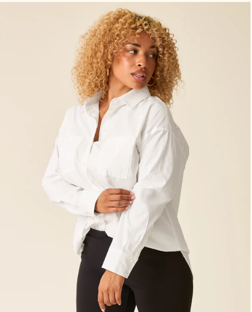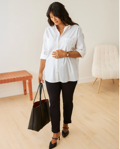 An elevated essential, with a fit that works before, during, and after pregnancy. This classic poplin button-up is as versatile as it gets – easy to dress up for work or wear casually on the weekend. With its crisp but comfortable cotton fabric, timeless silhouette, and nursing-friendly button front, it’s the kind of shirt every mom needs in her closet.