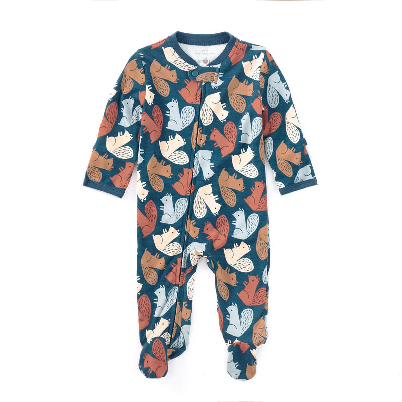 Get ready for some nutty fun! Our Squirrel Scurry footie is made for little ones who are always on the move—whether they’re wiggling, giggling, or snuggling. Covered in a flurry of curious squirrels and acorn leaves, this cozy one-piece is a woodland wonder. The double zipper makes changes quick as a flick of a tail, so you can zip up or down without the acorn fuss. Plus, the foldover sleeves turn into built-in mittens to keep tiny nails from scratching delicate cheeks—because even baby squirrels need protecting!