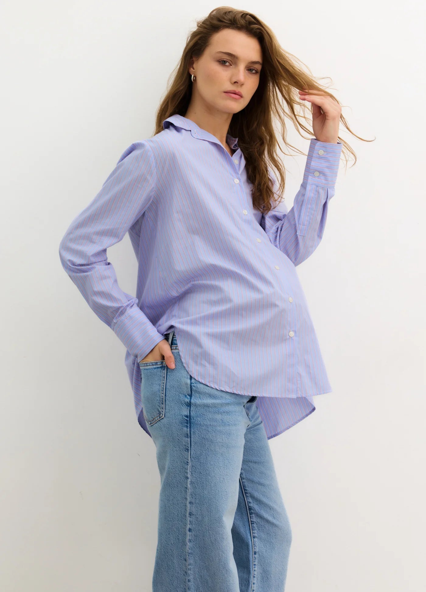 In lightweight cotton shirting, HATCH's spin on the classic button down hits all the marks: a crisp collar, inverted pleat at center back and stiff banded cuffs with a bias body, gusset piecing and a notched hem that flatters as your shape changes.