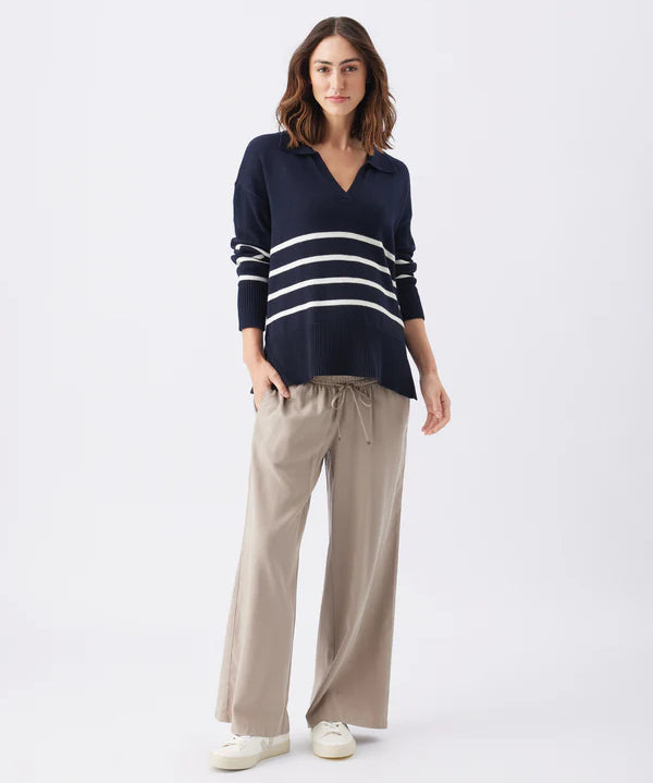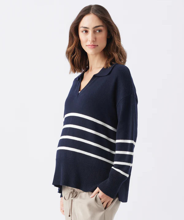 Spot shirt dress in navy with white polka dots. For maternity and nursing with button access for nursing and tie empire waist. Long sleeves and calf-length dress cut.