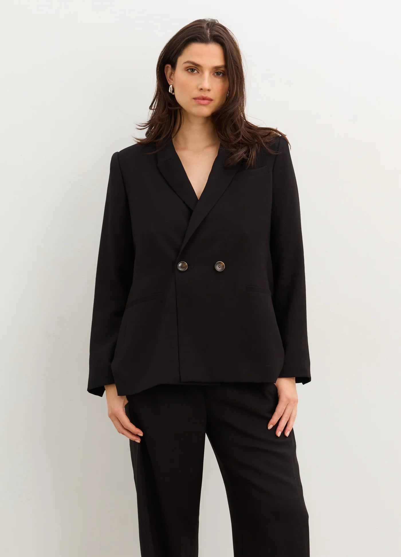 A softly structured blazer crafted in drapey twill for an elevated take on tailoring. Designed to layer effortlessly through pregnancy and beyond, this fully lined double-breasted piece is wrinkle resistant and features functional details including welt pockets, sleeve buttons, and a back vent for movement.