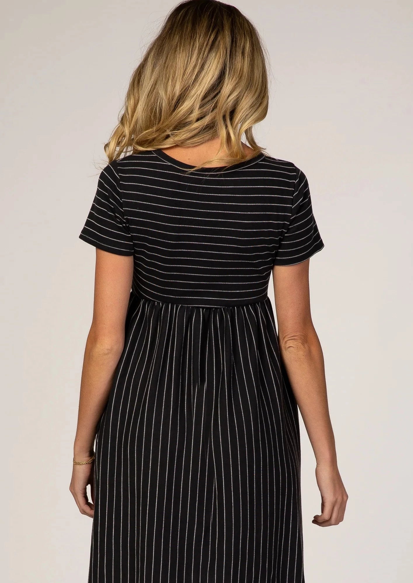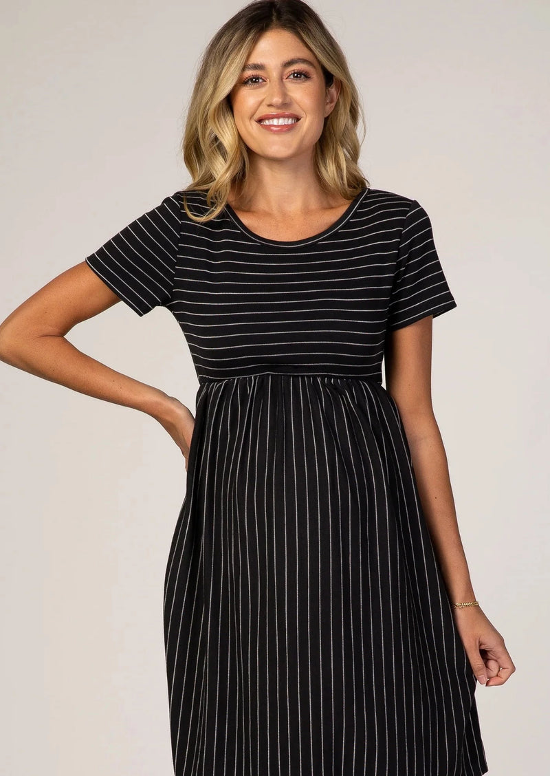 Stripes in all the right directions! Classic tee shirt dress in super soft rayon knit.