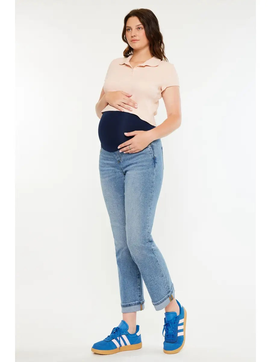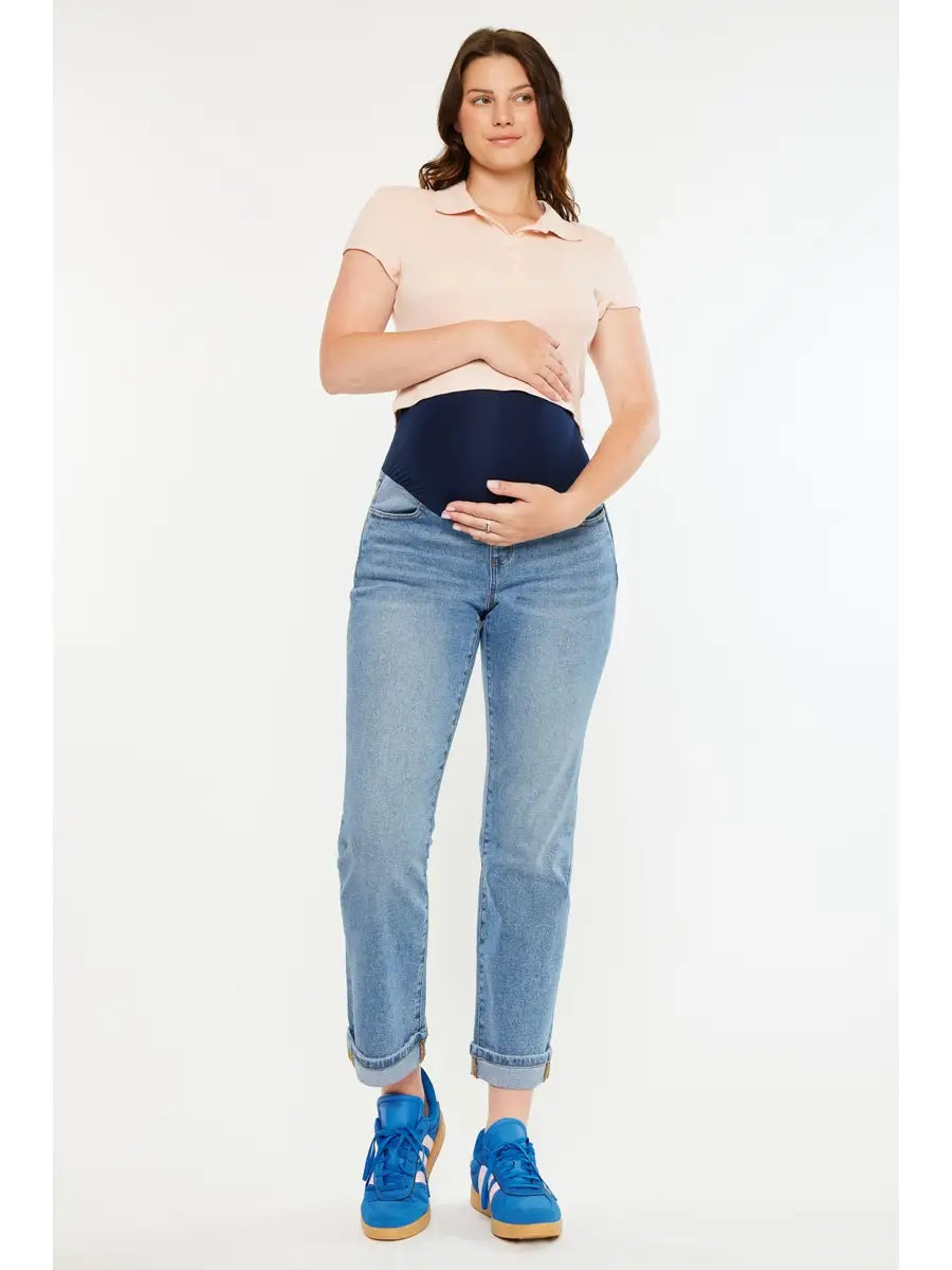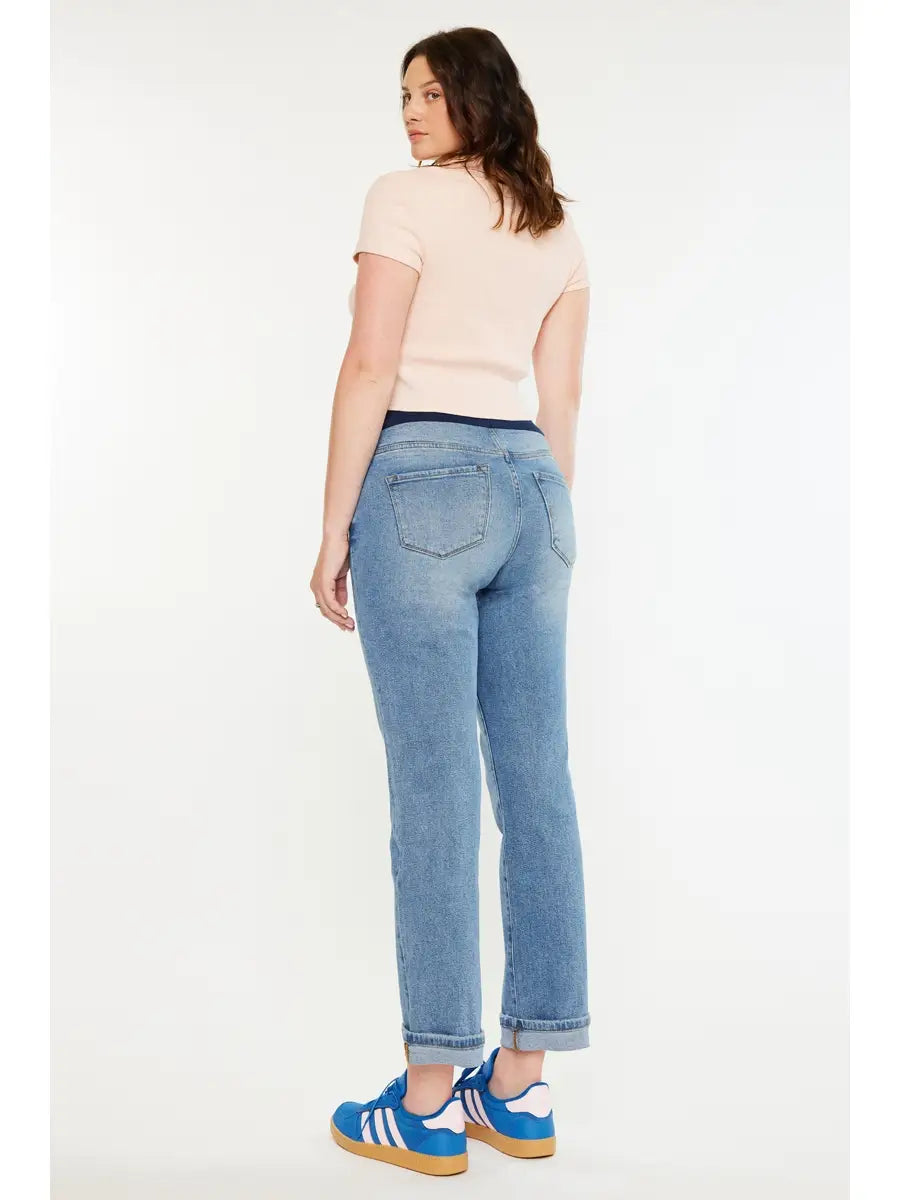 Kindra Maternity Boyfriend Jeans are both comfort and stylish! These stretchy denim jeans come in the classic boyfriend fit while still allowing the flexibility to keep you comfortable during the day. Features an insert side band, whiskering, fading, and zip fly.