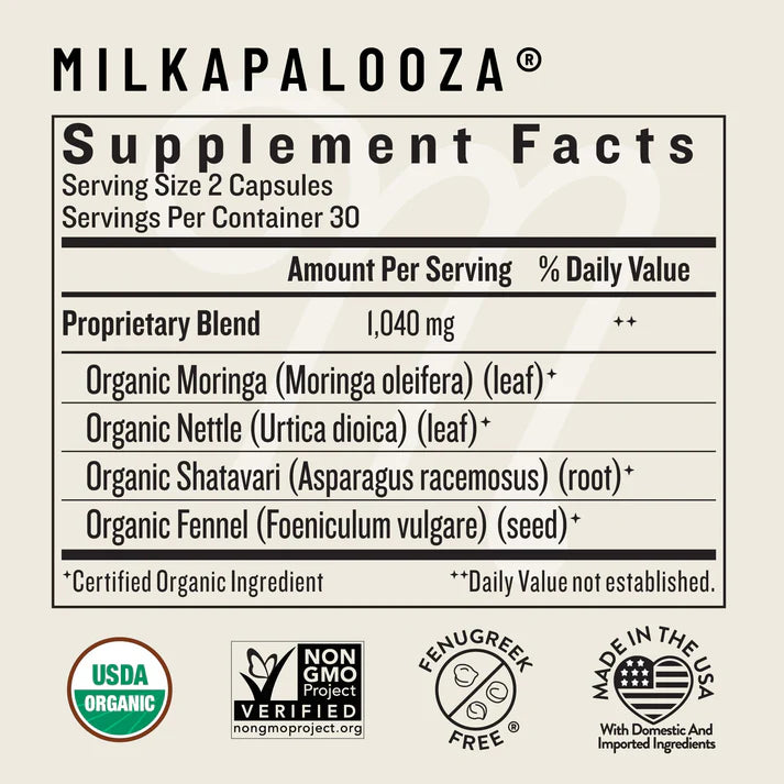 "Don't cry over spilled milk -- said no pumping mom ever." Milkapalooza® contains a blend of organic ingredients designed to optimize healthy lactation and enhance nutrition in breast milk.