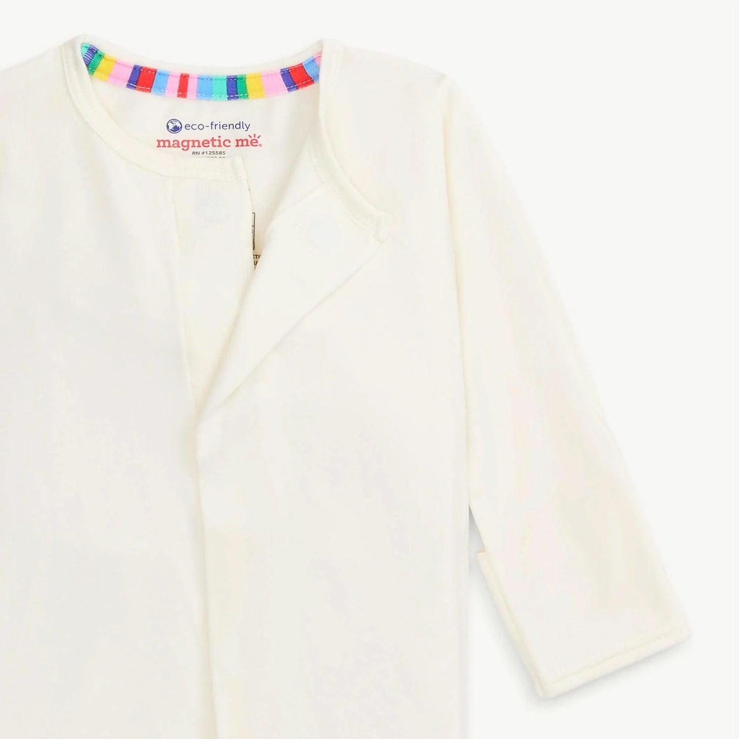 • magnetic closures: magnets line the seam from the neck to upper thigh for sizes up to 0-3m & from neck to crotch for sizes 3-6m and up.