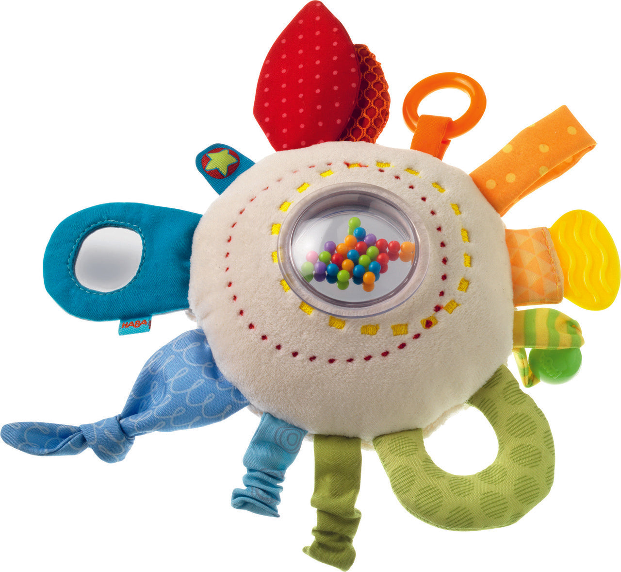 Ideal for home or on- the- go, this soft, snuggly mirrored teether will not only soothe baby’s gums, it will delight their senses with its many features. The loops and tags of bright primary colors offer different textures for babies to explore with their hands and mouths, while the crinkling and rattling sounds will endlessly enchant little ears. Easy for small fingers to grip and manipulate, this plush teether is an excellent tool to develop hand-eye coordination and fine motor skills.